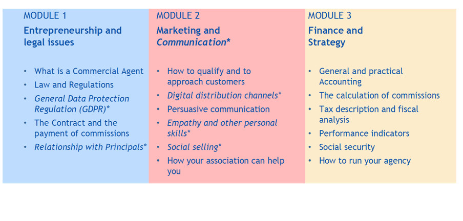 La globalización y las herramientas de comunicación tecnológica requieren unaadaptación continua de los Agentes Comerciales a los constantes cambios y el aprovechamiento de las oportunidades educativas disponibles para estar bien preparados para alcanzar el más alto nivel de rendimiento. El Grupo de Expertos de la IUCAB elaboró un marco de formación con diferentes módulos de formación para las Asociaciones Miembro. El objetivo es armonizar la formación, animar a los Agentes Comerciales y a todas las personas interesadas en asistir a estos cursos de formación y entregarles un certificado otorgado por su asociación miembro y validado por la IUCAB.